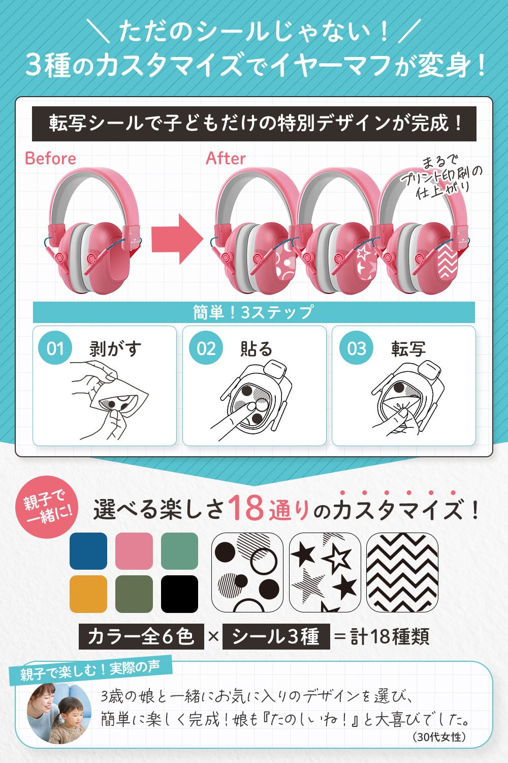 ✅【カスタマイズ転写シール付】まるでプリントのように仕上がる転写シール(3種類)が付属しているので、子供の好みに合わせて自由にカスタマイズできるイヤーマフです。